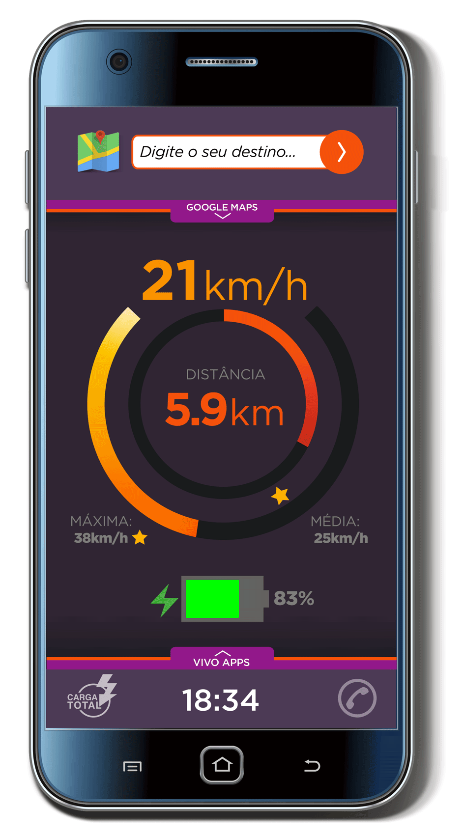 Ao colocar o aparelho no dock e plugar o cabo de força, o app Bike Sampa+Vivo abre o Display Integrado. Equipado com velocímetro, contador de distância e integração com o Google Maps, caso vc queria saber o melhor trajeto para o seu destino. Sempre trazendo a estação mais próxima do seu destino.